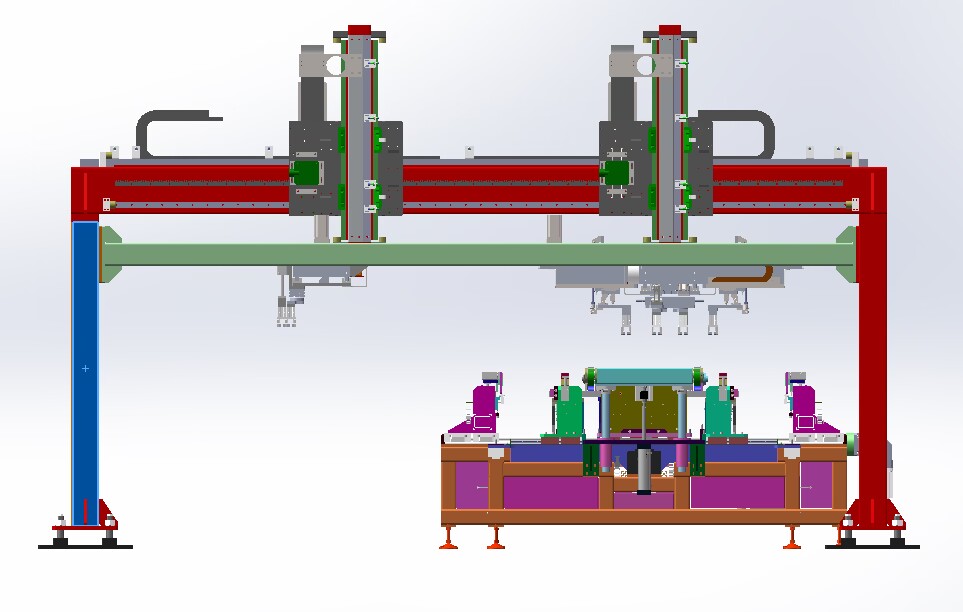 自動排版機的主要功能單元有:玻璃輸送定位系統、抓取行走系統、視覺檢測系統、電控系統等;通過以上功能單元,實現了將自動串焊機串焊好的電池串,按照工藝尺寸要求和排版方向順序自動排版鋪設到玻璃(EVA已經鋪設)上,組成電池串陣列。玻璃/EVA通過傳輸線傳輸至指定位置,機械手抓取電池串實現CCD定位、自動旋轉、自動排版功能。設備通過同步帶傳輸與自動生產線對接,實現了自動流水作業。